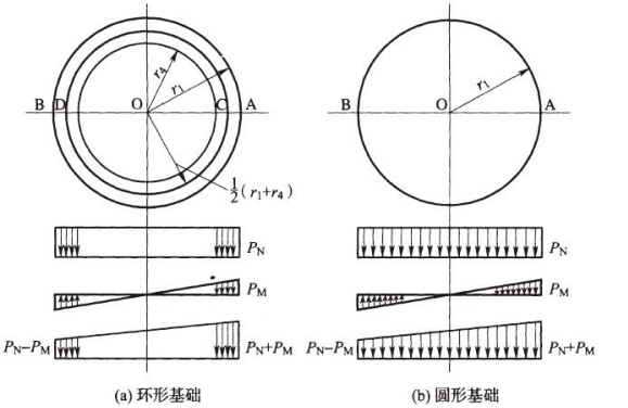 計(jì)算環(huán)形基礎(chǔ)在三角形荷載作用下的傾斜值時(shí),可按半徑r1的圓板在三角形荷載作用下,算得的A、B兩點(diǎn)沉降值,減去半徑為r4的圓板在相應(yīng)的梯形荷載作用下,算得的A、B兩點(diǎn)沉降值。